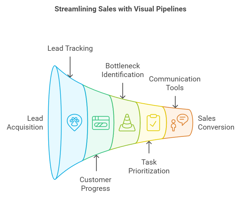 Sales & Task Pipelines: Automated pipeline management system, including communication tools, and the ability to track lead progress.